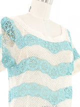 - Cotton hand-crocheted teal and white striped floral t-shirt top